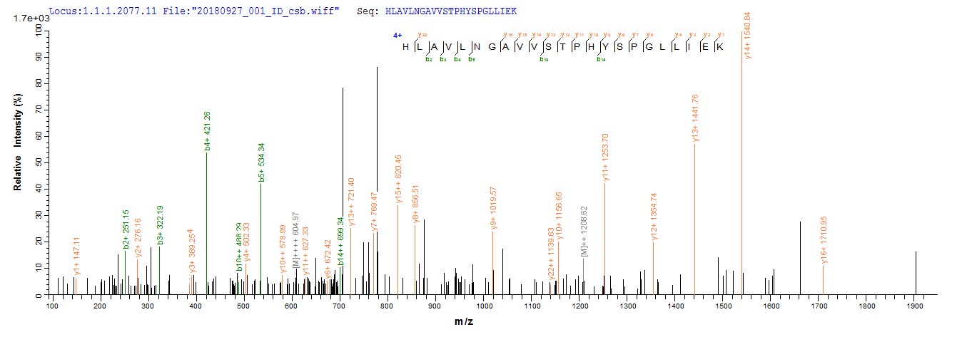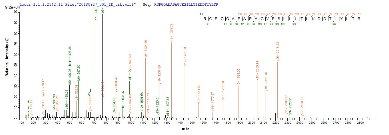 Based on the SEQUEST from database of E.coli host and target protein, the LC-MS/MS Analysis result of CSB-EP015222HU could indicate that this peptide derived from E.coli-expressed Homo sapiens (Human) MUC2.
