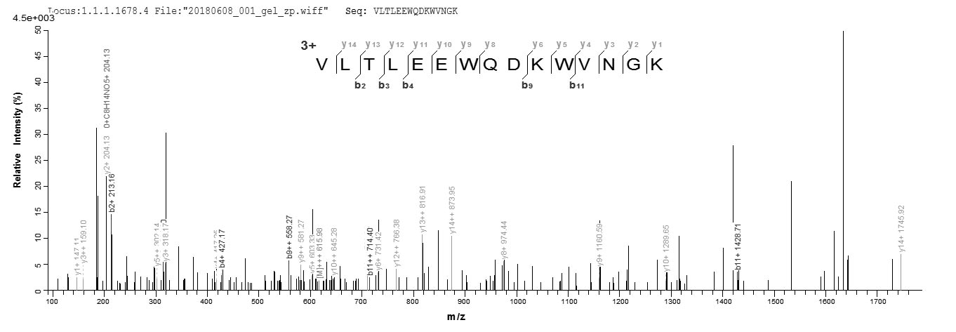 Based on the SEQUEST from database of E.coli host and target protein, the LC-MS/MS Analysis result of CSB-RP005854h could indicate that this peptide derived from E.coli-expressed Homo sapiens (Human) TPMT.
