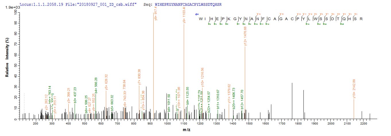 Based on the SEQUEST from database of E.coli host and target protein, the LC-MS/MS Analysis result of CSB-EP023448HU1 could indicate that this peptide derived from E.coli-expressed Homo sapiens (Human) TGFB2.