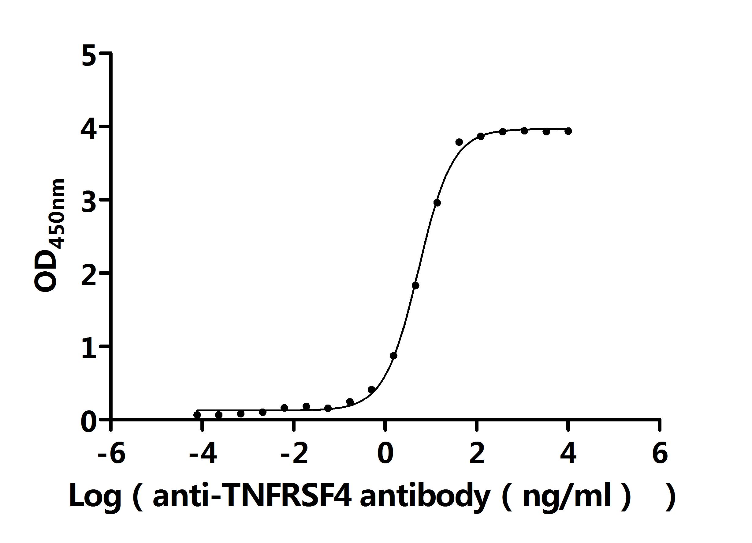 生物活性:Measured by its binding ability in a functional ELISA. Immobilized Human TNFRSF4 at 2 μg/mL can bind Anti-TNFRSF4 recombinant antibody (CSB-RA023981MA1HU). The EC50 is 4.882-5.863 ng/mL.