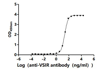 Measured by its binding ability in a functional ELISA. Immobilized Human VSIR at 2 μg/ml can bind Anti-VSIR recombinant antibody (CSB-RA884484MA1HU). The EC50 is 20.84-22.73 ng/mL. Biological Activity Assay