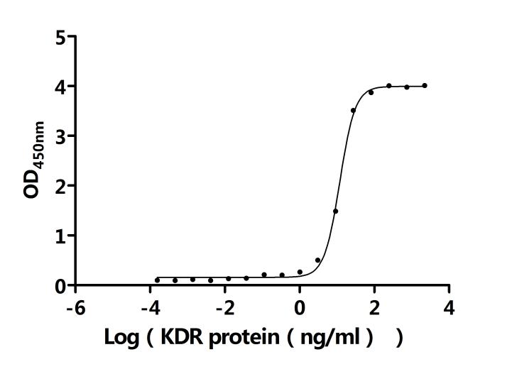 Measured by its binding ability in a functional ELISA.Immobilized Human VEGFA(CSB-MP025833HU(F4)) at 2 μg/ml can bind Human KDR. The EC50 is 11.19-12.63 ng/mL. -