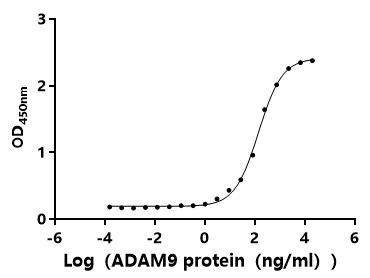 Measured by its binding ability in a functional ELISA.Immobilized Anti-ADAM9 recombinant antibody(CSB-RA618774MA1HU) at 2 μg/ml can bind Macaca fascicularis ADAM9.The EC50 is 114.4-171.1 ng/mL.