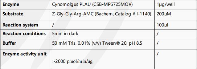 生物活性:Fully active measured by its ability to cleave a peptide substrate, N-carbobenzyloxy-Gly-Gly-Arg-7-amido-4-methylcoumarin (Z-GGR-AMC). PLAU needs to be activated by Plasmin to be enzymatically active. The specific activity is > 2000 pmol/min/ug.