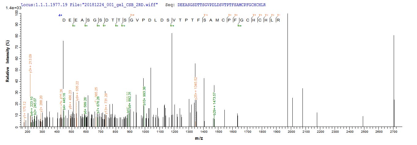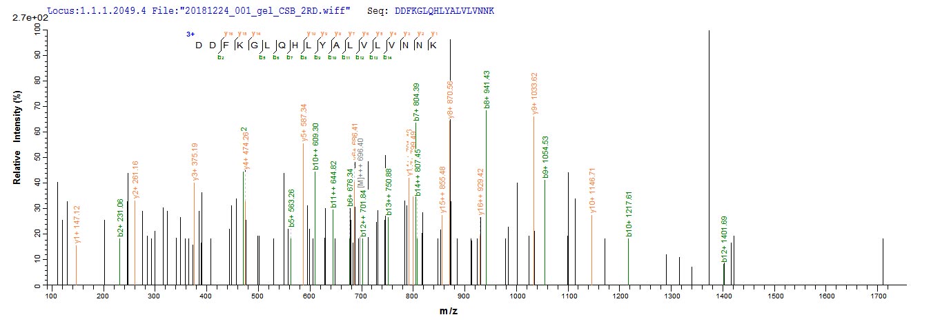 Based on the SEQUEST from database of E.coli host and target protein, the LC-MS/MS Analysis result of CSB-EP002683MO could indicate that this peptide derived from E.coli-expressed Mus musculus (Mouse) Bgn.