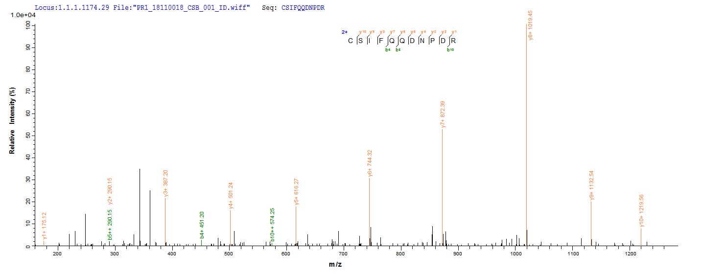 Based on the SEQUEST from database of Yeast host and target protein, the LC-MS/MS Analysis result of CSB-YP004844MO could indicate that this peptide derived from Yeast-expressed Mus musculus (Mouse) Ccr5.