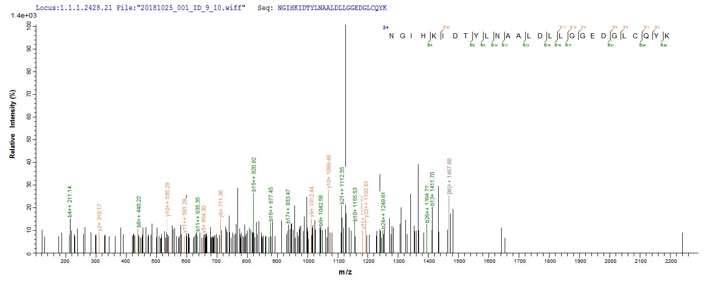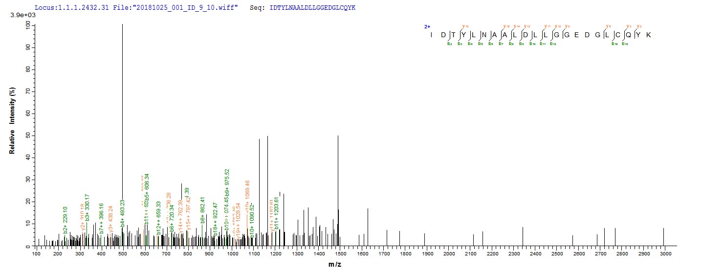 Based on the SEQUEST from database of E.coli host and target protein, the LC-MS/MS Analysis result of CSB-EP863638MO could indicate that this peptide derived from E.coli-expressed Mus musculus (Mouse) PLA2G12A.