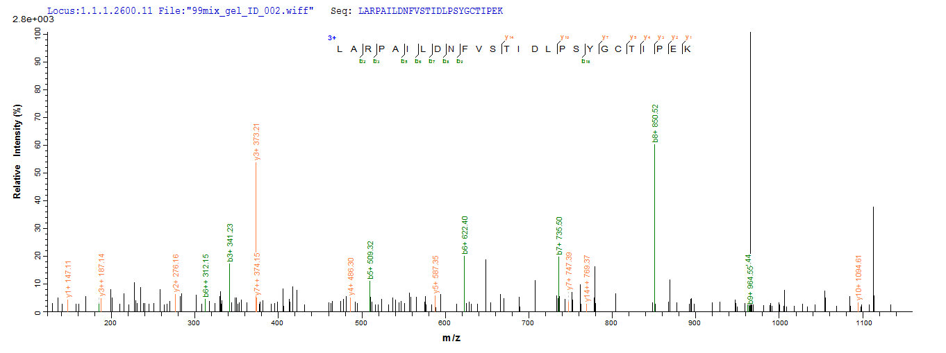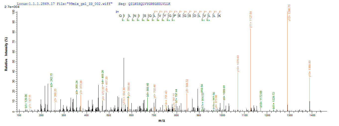 Based on the SEQUEST from database of E.coli host and target protein, the LC-MS/MS Analysis result of CSB-RP084844R could indicate that this peptide derived from E.coli-expressed Rattus norvegicus (Rat) Hgf.