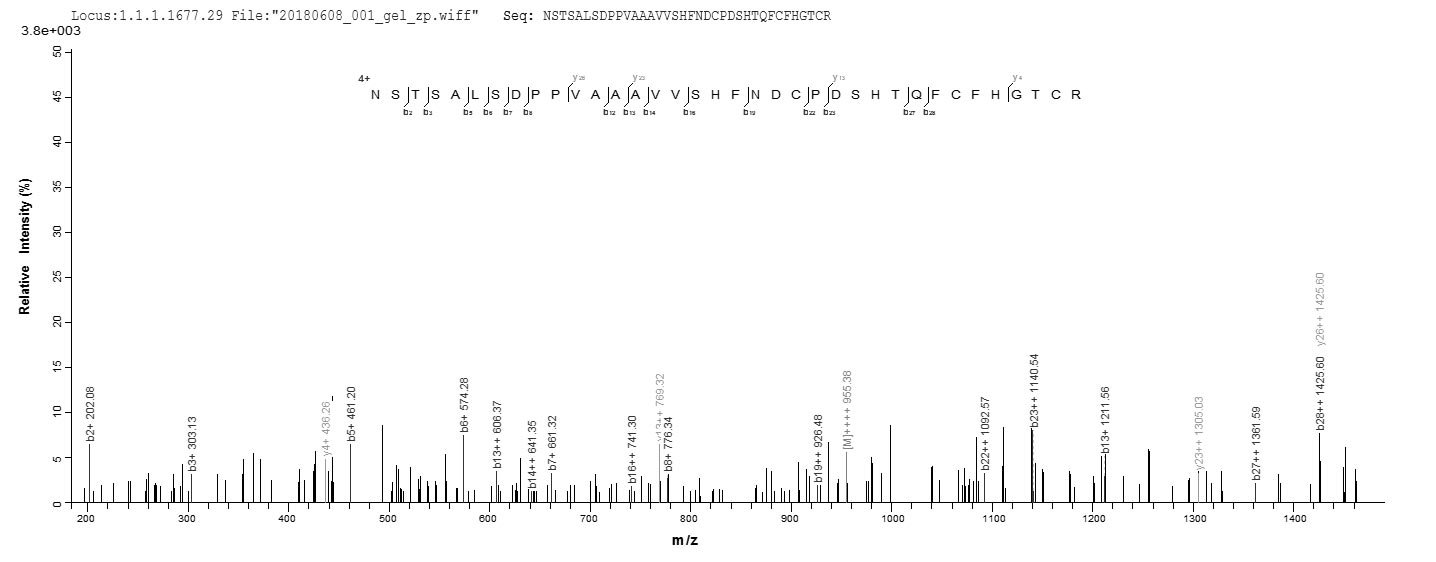 Based on the SEQUEST from database of E.coli host and target protein, the LC-MS/MS Analysis result of CSB-EP023445SH could indicate that this peptide derived from E.coli-expressed Ovis aries (Sheep) TGFA.