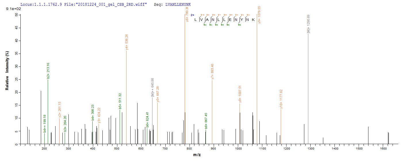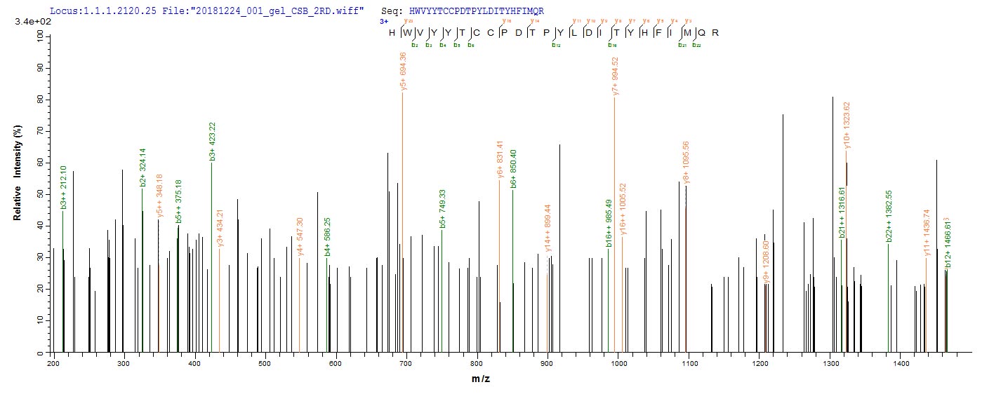 Based on the SEQUEST from database of E.coli host and target protein, the LC-MS/MS Analysis result of CSB-EP005386TOTa2 could indicate that this peptide derived from E.coli-expressed Tetronarce californica (Pacific electric ray) (Torpedo californica) CHRNA1.