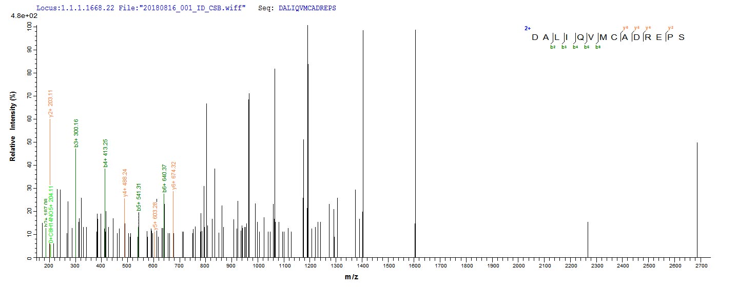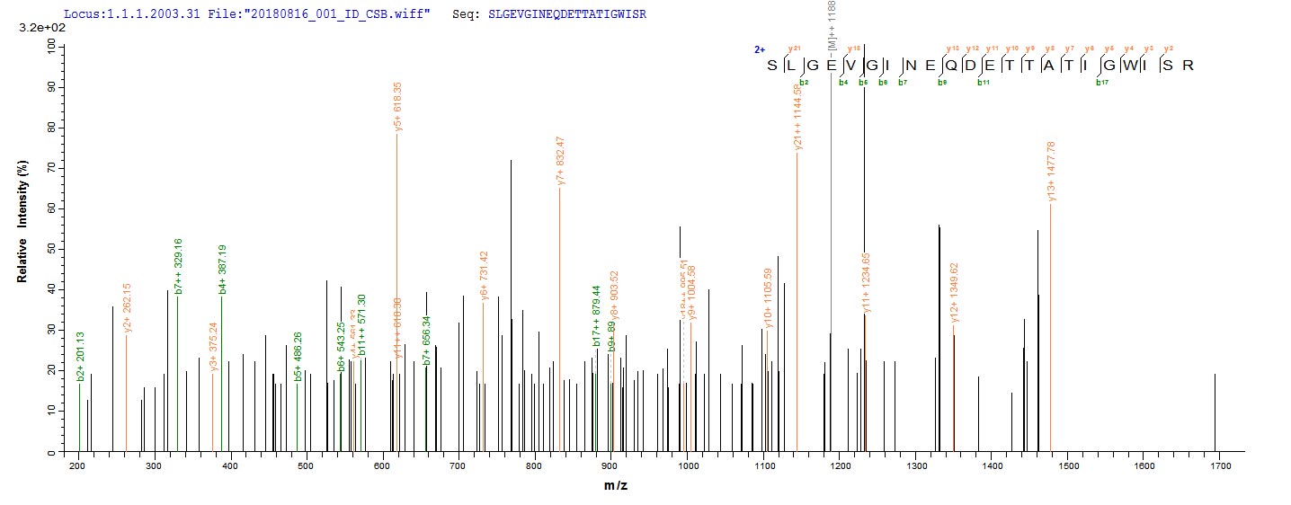 • Based on the SEQUEST from database of E.coli host and target protein, the LC-MS/MS Analysis result of CSB-EP528172TPR1 could indicate that this peptide derived from E.coli-expressed Treponema pallidum (strain Nichols) TP_0608.