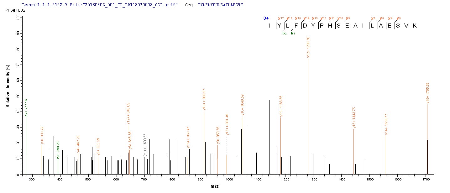 Based on the SEQUEST from database of E.coli host and target protein, the LC-MS/MS Analysis result of CSB-EP321831VAA could indicate that this peptide derived from E.coli-expressed Vaccinia virus (strain Copenhagen) (VACV) K3L.