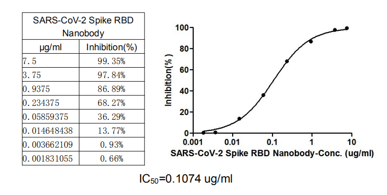 Binding signal of SARS-CoV-2-S1-RBD (CSB-YP3324GMY1) and ACE2-HRP (CSB-YP3324GMY1) was inhibited by SARS-CoV-2 Spike RBD Nanobody (CSB-RA33245A2GMY) with the IC50 is 0.1074 μg/mL.