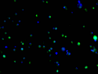 Immunofluorescence staining of 293F cells with CSB-MA000141M0m at 1:100, counter-stained with DAPI. The cells were blocked in 10% normal Goat Serum and then incubated with the primary antibody overnight at 4°C. The secondary antibody was Alexa Fluor 488-congugated AffiniPure Goat Anti-Mouse IgG(H+L).
