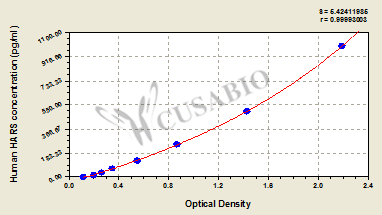 通過線性范圍來計算出實際的檢測樣本值,定量試劑盒標準曲線的相關(guān)系數(shù)R大于0.99。以CSB-E07270h(人脂聯(lián)素(ADP)ELISA Kit)為例的標準曲線。