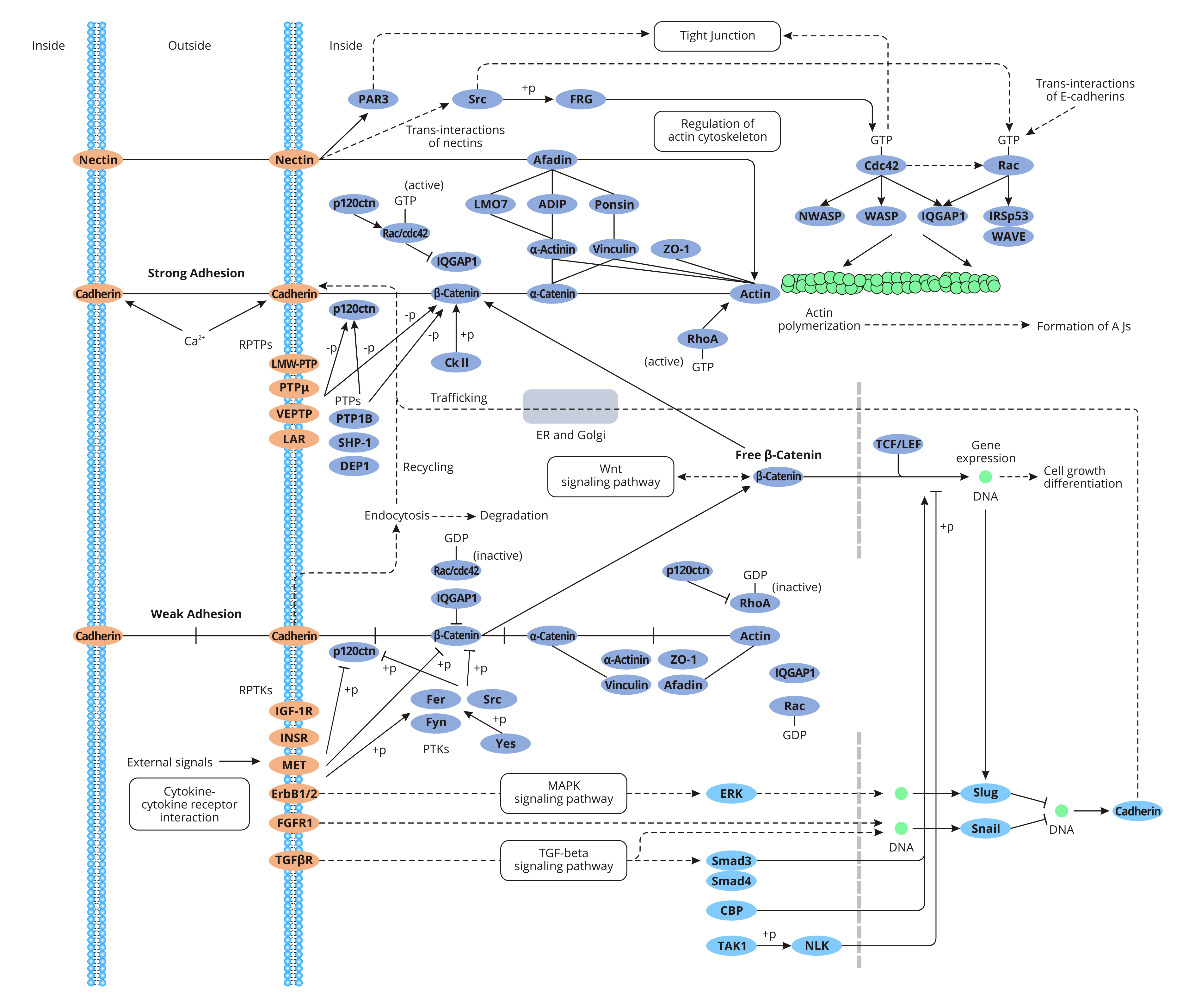 Adherens junction(緊密連接)是細(xì)胞間連接的一種,它由轉(zhuǎn)膜蛋白質(zhì)組成。這些蛋白質(zhì)通過(guò)一個(gè)稱(chēng)為Cadherin的整合素進(jìn)行相互作用,從而將鄰近的細(xì)胞黏合在一起。Cadherin順著細(xì)胞膜形成了一條粘連帶,與其它Cadherin相互作用,從而穩(wěn)定兩個(gè)細(xì)胞之間的連接。Adherens junction不僅連接鄰近的細(xì)胞,還可以連接細(xì)胞內(nèi)各個(gè)部分,例如肌肉細(xì)胞會(huì)通過(guò)Adherens junctions連接到肌束骨架上,從而產(chǎn)生力量。Adherens junctions在許多生理過(guò)程中發(fā)揮重要作用,例如在胚胎發(fā)育、組織修復(fù)、神經(jīng)系統(tǒng)和免疫系統(tǒng)中。此外,失去Adherens junctions與癌癥、心血管疾病和其他疾病有關(guān)。